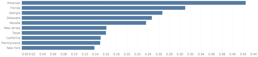 The first thing to notice from the data is that slightly darker hue of blue which grips a good portion of the South. Arkansas, Florida, Georgia, and Texas are all experiencing serial upticks in the financial stress of citizens as measured by complaints against their providers.